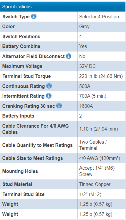 - Accepts two 4/0 AWG (95mm²) battery cables