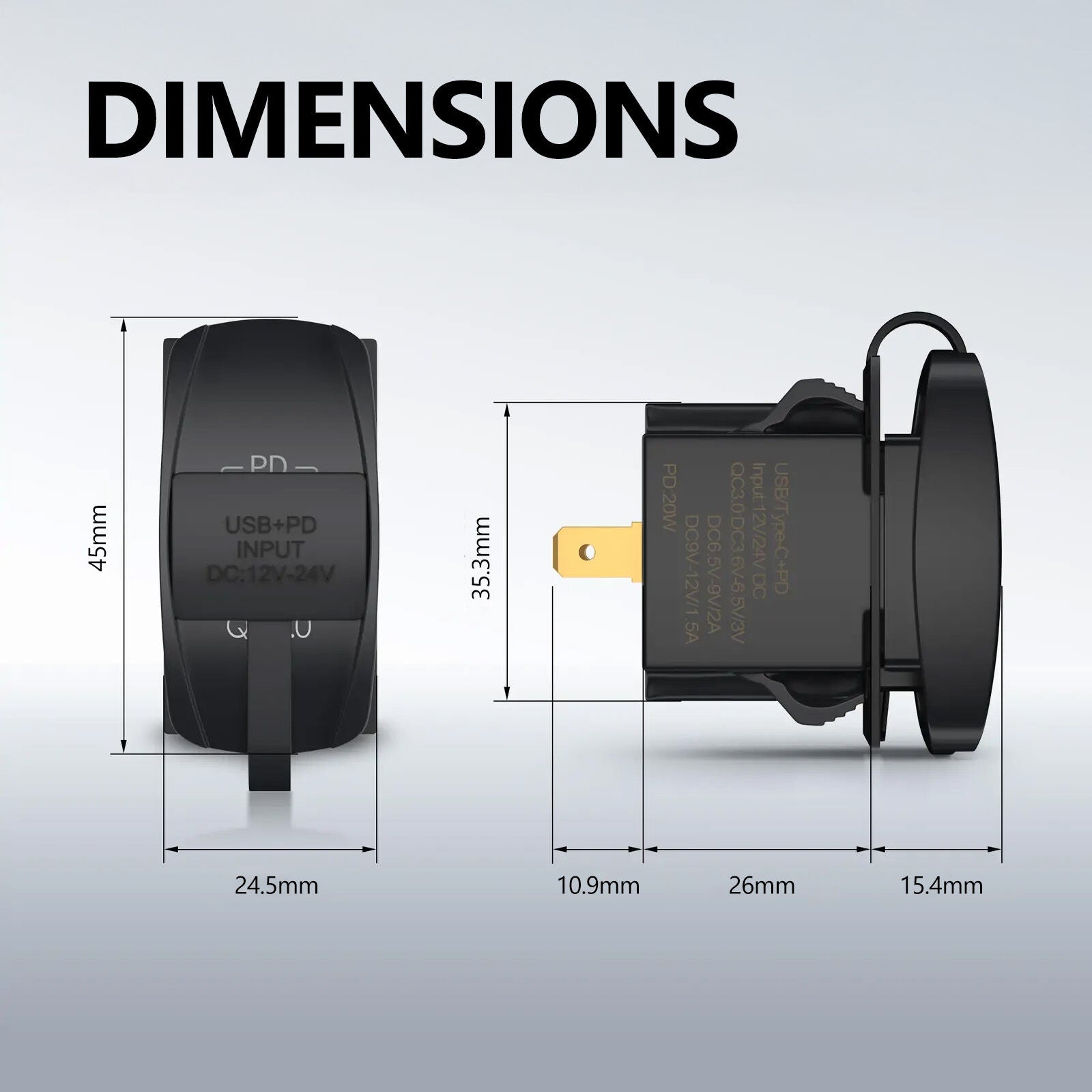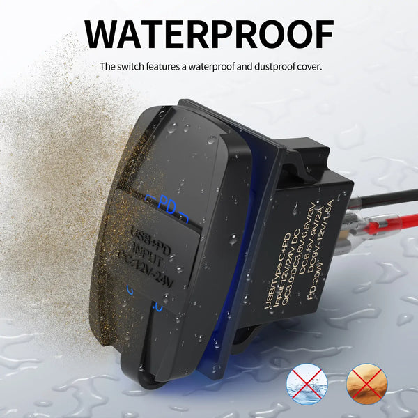 The Exotronic 38W Dual-Port USB Rocker Switch Charger is a high-performance charging solution that integrates seamlessly into your existing rocker switch panel. With a combined output of 38W, this unit features both USB-C Power Delivery (PD 3.0) and USB-A Quick Charge (QC 3.0) technologies, making it perfect for rapidly charging modern smartphones, tablets, and other USB devices. Built with a 10A fuse for overcurrent protection, it's ideal for automotive, marine, and RV applications where safety and performance are key.