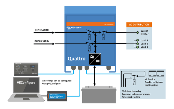 Designed for easy integration with solar PV and other renewable energy systems, the Quattro enhances your ability to maintain a sustainable and eco-friendly lifestyle. Enjoy the benefits of clean energy while ensuring that AC power is available, even during grid failures, for a truly autonomous living experience.
