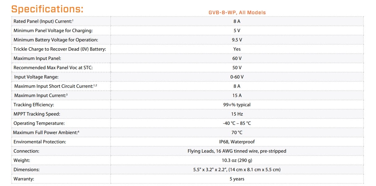 Boosts lower-voltage solar panels up to charge higher voltage 12V lithium batteries. 24V also available.
