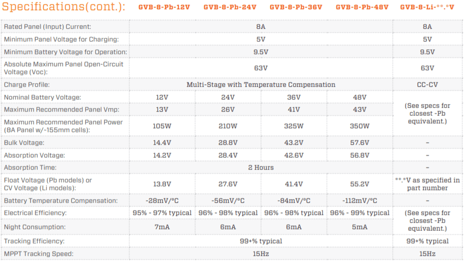 Boosts lower-voltage solar panels up to charge higher-voltage lead-acid batteries. 24V, 36V & 48V also available