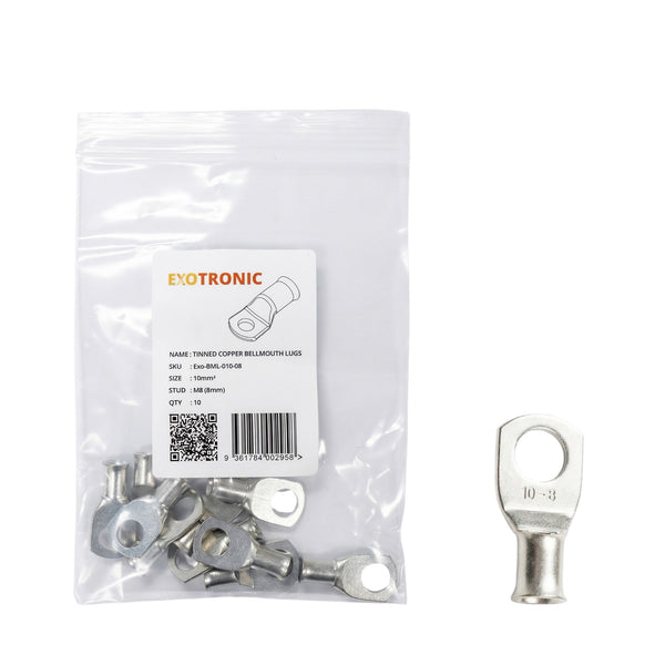 10 Pack of Exotronic 10mm² Copper Lug M8 | Bellmouth – High-Performance Tinned Battery Lugs