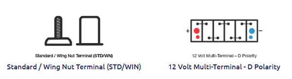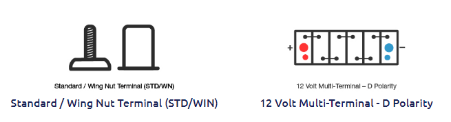 Schematics illustrating the Standard/Wing Nut (STD/WNUT) terminal types and 12 Volt D Polarity configuration.