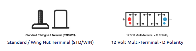 Features versatile standard and wing nut (STD/WN) terminals with a D-polarity configuration for multi-angle fitment.