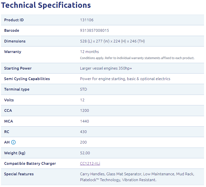 | Special features | Carry Handles, Glass Mat Separator, Low Maintenance, Mud Rack, Platelock™ Technology, Vibration Resistant. |