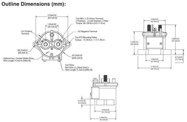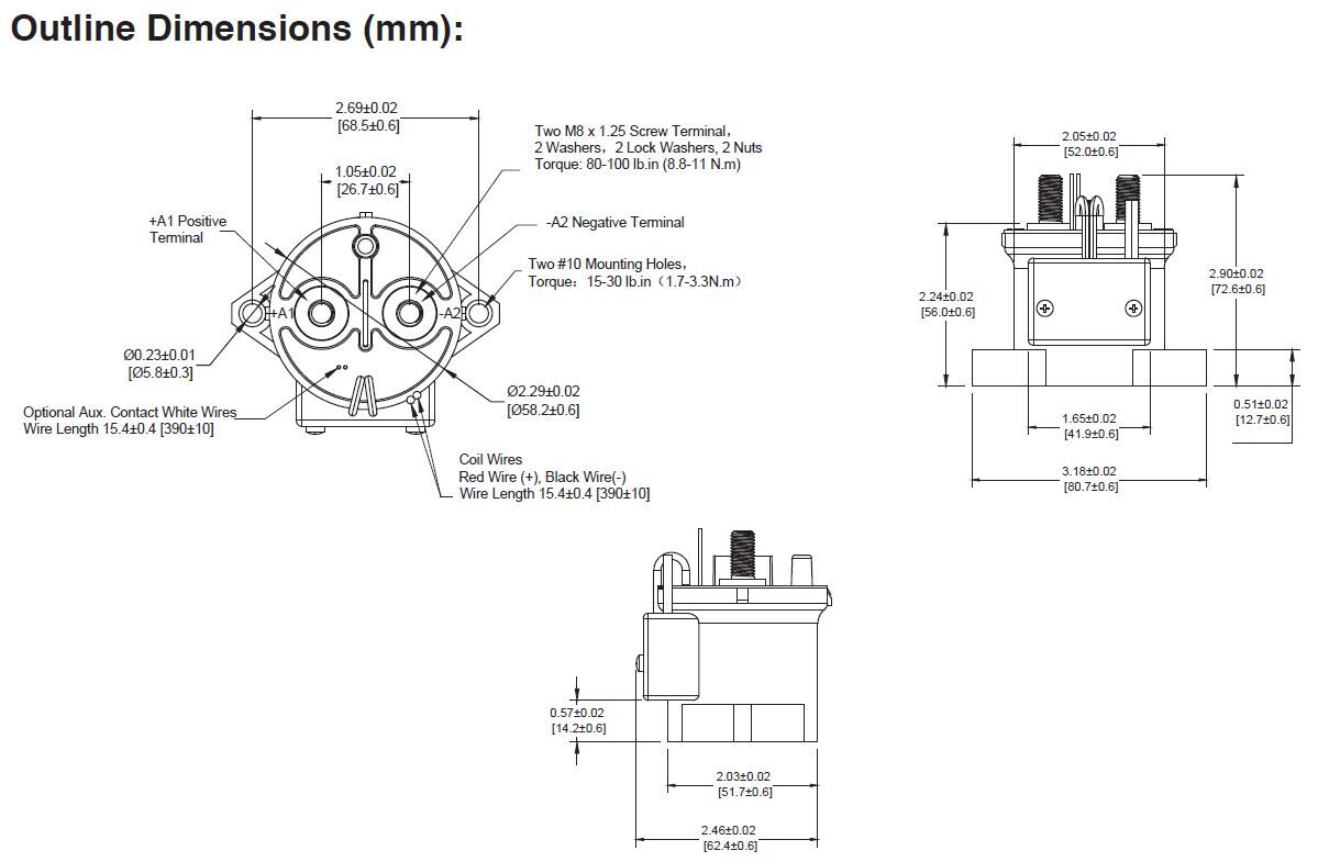 Key features: M8 x 1.25 screw terminals with 8.8-11 Nm torque rating, Dual #10 mounting holes with 1.7-3.3 Nm torque rating, 80.7mm total width and 72.6mm total height, 390mm standard coil wire length.