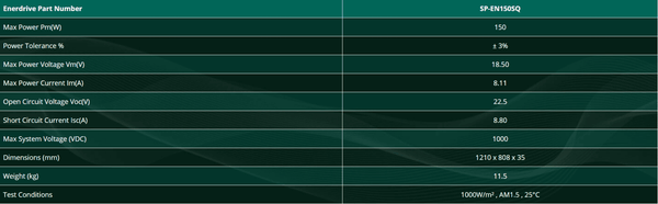 Front view of Enerdrive 150W monocrystalline fixed solar panel with black frameKey features: High-efficiency monocrystalline solar cells, Black powder-coated aluminium frame, Compact square form factor.Technical specifications table for SP-EN150SQ listing dimensions and electrical data