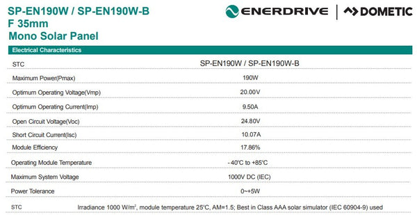 Features Enerdrive solar panels are typically around 20+vdc open circuit and are well suited to 12v installations (or 24v by series connections of panels).