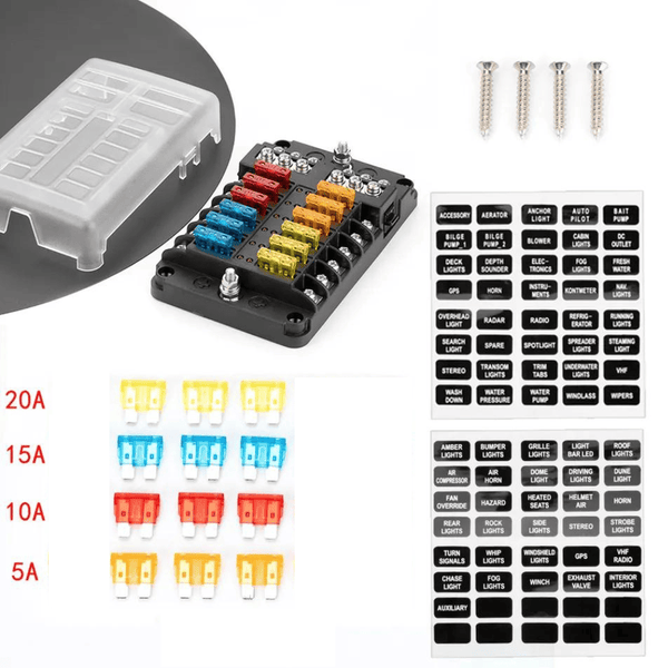 Key features: Includes assorted blade fuses (5A, 10A, 15A, 20A), Pre-printed sticker labels for circuit identification, Transparent moisture-proof protective cover, Includes stainless steel mounting screws.