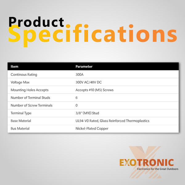 Enhance the efficiency and safety of your 12V, 24V or 48V electrical systems with the Exotronic Busbar. This premium busbar is specifically designed for high-performance requirements, crafted from tinned copper to ensure excellent conductivity and outstanding corrosion resistance. It's an indispensable component for any robust and reliable power distribution system.