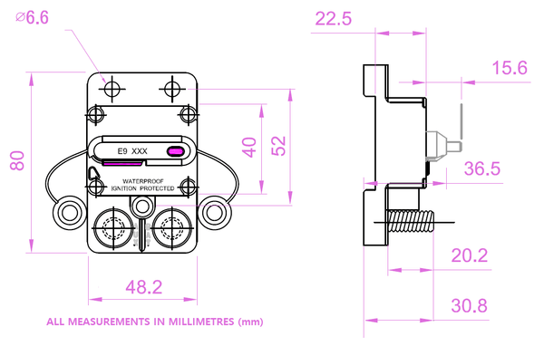 Exotronic 80A Surface Mount Waterproof DC Circuit Breaker - Side by Side