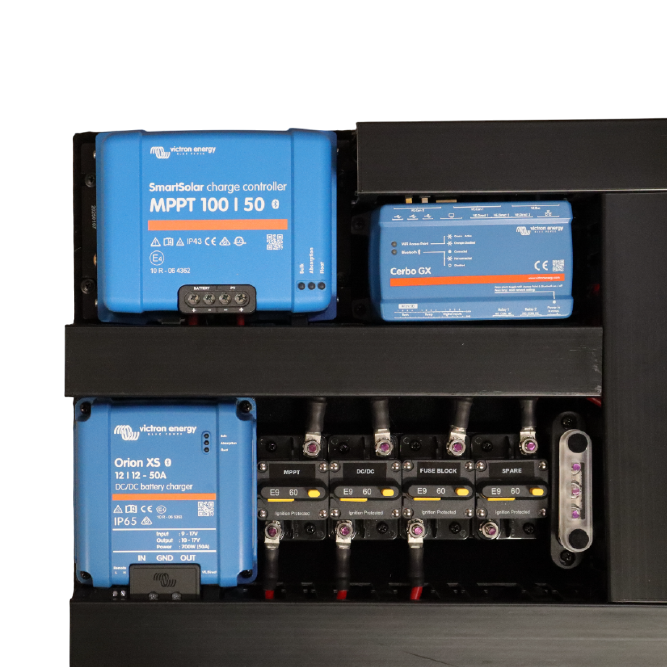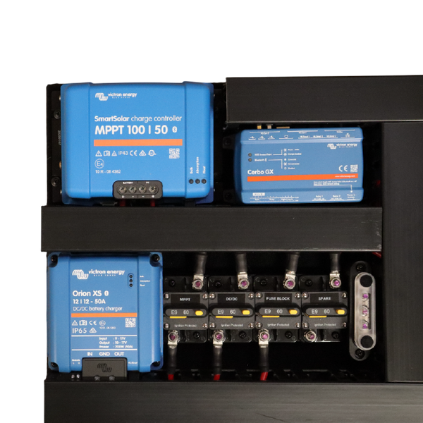 Highlights:SmartSolar MPPT: Victron SmartSolar MPPT 100|50 charge controller,Cerbo GX: Victron Cerbo GX communication centre,AC Circuit Protection: RCBOs and circuit breakers for AC safety,Orion XS DC-DC: Victron Orion XS 12|12-50 DC-DC battery charger,MIDI Fuse Holders: High-current MIDI fuse protection for DC circuits,12V Fuse Block: Central fuse block for auxiliary DC loads,Input Circuit: Mega fuse & SmartShunt,Battery Protect: Protects battery from 12V fuse block causing excessive draw down,PV Isolator: Meets new regulatory requirements.