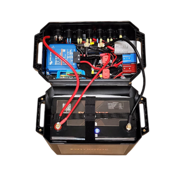 Highlights:Orion XS Charger: Victron Orion XS 12/12-50A DC-DC Charger mounted to lid,Circuit Protection: Internal fusing and distribution wiring,Socket Connections: Rear wiring of Anderson, USB and 12V sockets,Lithium Battery: Exotronic 180Ah Alpha Battery secured in base,Anderson Connectors: 2x 50A Grey Input/Output, 1x 50A Blue Starter Battery Input, 1x 50A Red Solar Input,Victron SmartSolar: Victron 75/15 SmartSolar Solar Charge Controller mounted to lid,Victron SmartShunt: Victron 300A SmartShunt Bluetooth Battery Monitor mounted to lid.