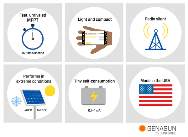 Key features: Fast 15Hz MPPT tracking speed, Radio silent operation suitable for sensitive equipment, Tiny self-consumption (0.1 - 1 mA), Performs in extreme temperatures (-40°C to 85°C), Made in the USA.