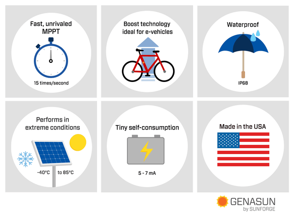 Key features: Fast MPPT tracking (15 times/second), Boost technology ideal for e-vehicles, IP68 Waterproof and weather-resistant, Operating temperature -40°C to 85°C, Ultra-low self-consumption (5-7 mA), Made in the USA.