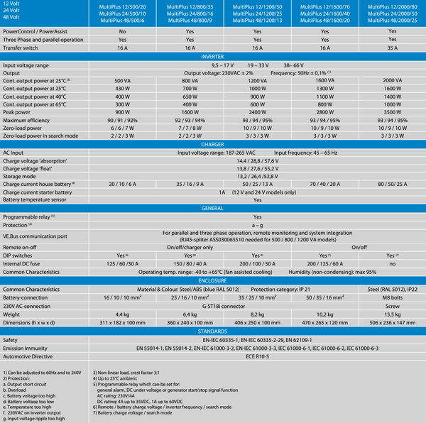 Key features: 1200VA continuous inverter output power, High-performance 50A adaptive battery charger, PowerAssist technology prevents overload of limited AC sources, Durable steel and ABS enclosure with IP21 protection, Sophisticated VE.Bus communication for system integration.
