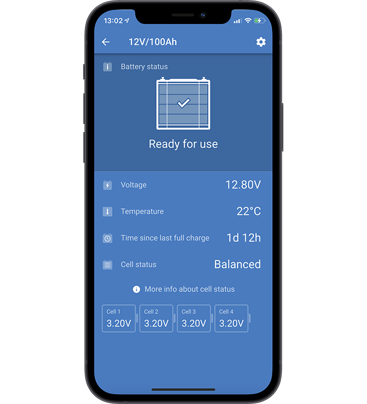 Monitor battery performance in real-time with the VictronConnect app, displaying individual cell voltages, battery temperature, and status.