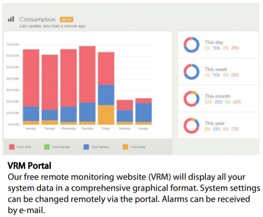 Screenshot of the Victron Remote Management (VRM) portal showing real-time and historical system performance data.