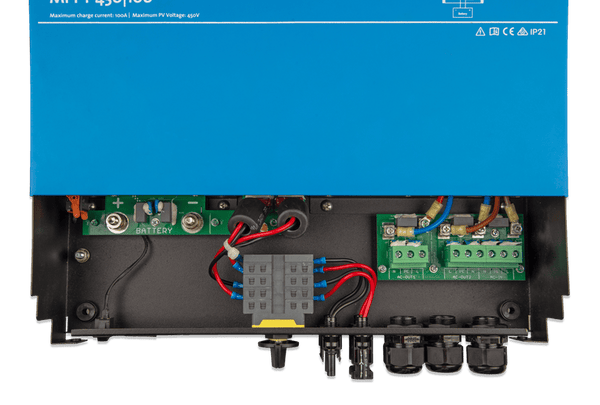 Highlights:M8 Battery Terminals: Secure high-current DC connection points with M8 bolts,AC Terminal Blocks: Screw terminals for 230V AC input and dual independent AC outputs,PV Isolation Switch: Integrated rotary switch for safely isolating the solar PV input,MC4 Solar Connectors: Standard MC4 inputs for dual high-voltage PV string connections,Communication Interface: VE.Direct, VE.Can and User I/O ports for data logging and system control.