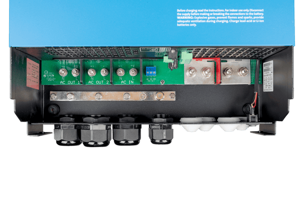 Front view of blue Victron MultiPlus-II 48V 8000VA inverter charger with status LED displayKey features: 8000VA continuous power output at 25°C, Integrated 110A battery charger for 48V systems, PowerControl and PowerAssist technology, Steel enclosure in RAL 5012 blue, IP22 protection rating.Angled side view of Victron MultiPlus-II showing blue steel enclosure and recessed side handleTechnical dimensional drawing of MultiPlus-II 8000VA showing height, width, and depth measurementsDetailed technical dimensions for the MultiPlus-II 8000VA enclosure, showing a height of 642mm, width of 363mm, and depth of 206mm for precise installation planning.Full technical specification table for the Victron MultiPlus-II 48V inverter charger seriesApplication diagram showing MultiPlus-II integrated with grid, generator, battery bank, and critical loadsInternal view of MultiPlus-II connection area with AC terminals, DC bolts, and communication portsHighlights:VE.Bus Ports: Dual RJ45 VE.Bus ports for system integration and parallel/three-phase configuration,AC Input and Outputs: M6 bolt connections for AC input and two separate AC outputs,DC Battery Connections: Four heavy-duty M8 bolts for secure 48V battery cable termination,I/O Communication Terminal: Green terminal block for auxiliary relay, temperature, and voltage sensing,Cable Glands: Pre-installed compression glands for secure and protected cable entry.Detailed view of AC input and output screw terminals and M8 DC battery connection boltsClose-up of the internal wiring base featuring M6 bolts for AC input/output terminals and four M8 bolts for high-current battery cable attachment.