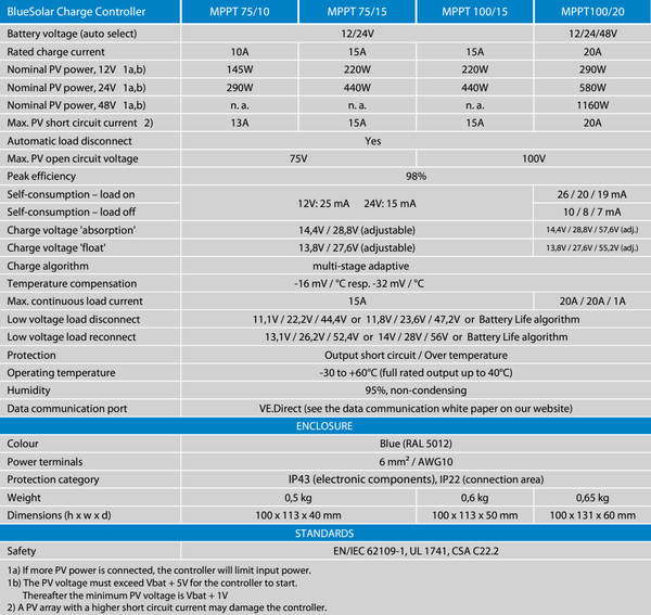 Technical specification comparison table for Victron BlueSolar MPPT models
