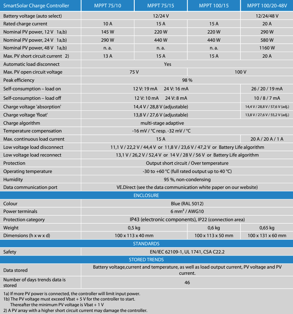 Technical specifications table for Victron SmartSolar MPPT charge controllers