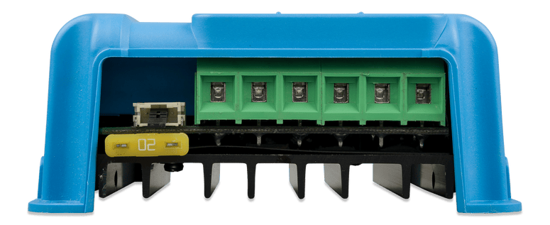 Detailed front view of the Victron controller terminal section, fuse, and cooling fins